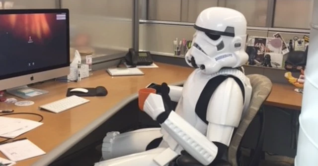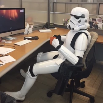 Cyberweavers love to donate their time and talent. Pictured here: a stormtrooper finishes some work before heading to a local children's hospital for their Star Wars Day celebration.